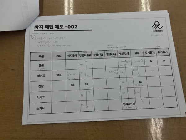 기본적으로 작업지시서에는 밑위길이와 밑폭이 적혀있지않기때문에 패턴사가 알아서 떠야한다.