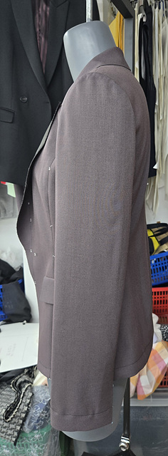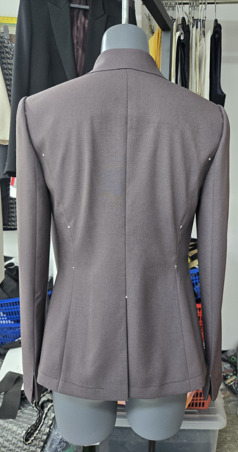 가봉 상태로 바디에 착장해 소매 곡선과 옆솔기, 그리고 전반적인 실루엣을 확인했어요.