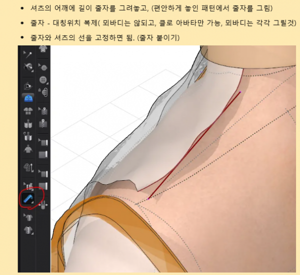 겉옷이 쉽게 벗겨지지 않도록 줄자를 아바타와 패턴에 고정하는 법도 배웠어요.