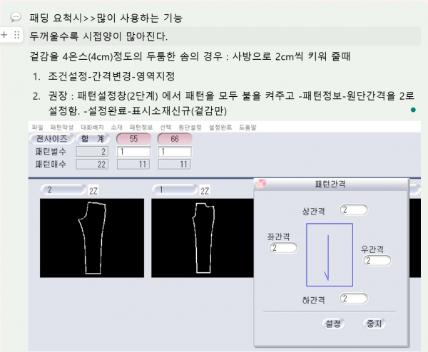 패턴 정보 설정에서는 제작할 의류의 패턴 개수와 작업지시서의 수량을 확인한 후, 요척을 평균값으로 설정하는 과정이 중요했습니다.