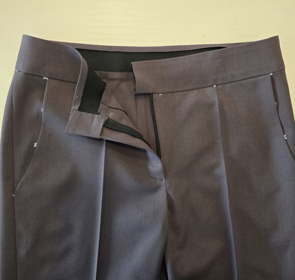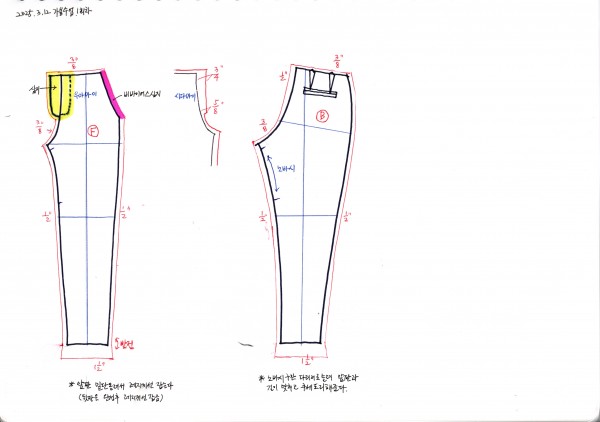 *바지 앞뒤판과 주머니바닥 패턴을 식서결에 맞추어 잘 마킹하고 분량의 시접을 주고 재단한다