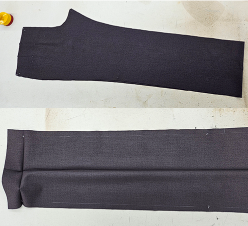 그다음 스태치부분 심지붙이고, 무릎선 표시, 주머니표시해줍니다.