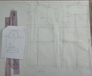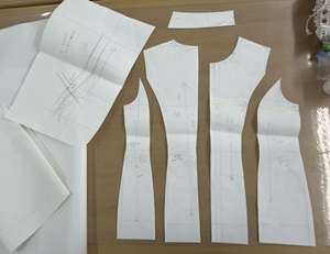 마네킹에 샘플로 입혀둔 블라우스의 치수를 재서 상의 기본 원형에서 블라우스 패턴을 그려보는 것으로