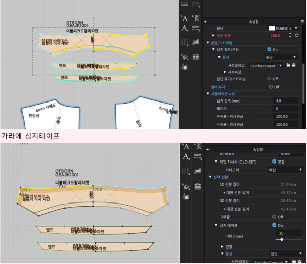 칼라는 밴드를 공용으로 2겹으로 설정하고, 심지를 언더칼라에 부착한 후 접힘 각도를 240도로 설정했어요.