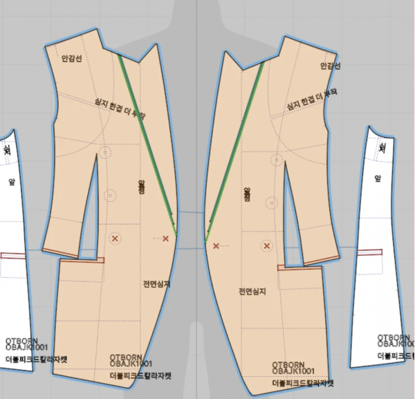 개별 배치를 진행하면서 포켓은 후반부에 배치했어요. 라펠과 칼라는 접어 배치했고, 소매 트임도 동일한 방식으로 처리했어요.
