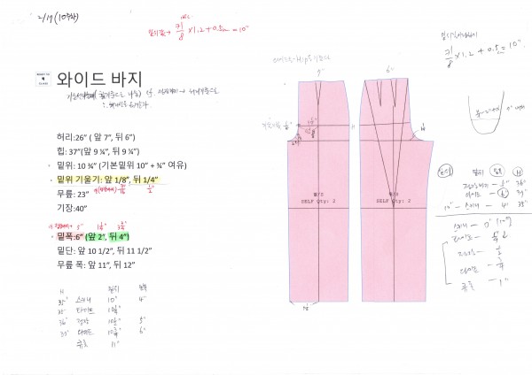 패턴수업 10주차로 지난주 기본정장바지에이어 와이드통바지를 배웠다