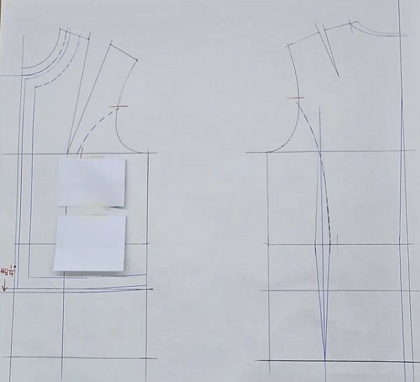 - 앞판의 중심쪽 프린세스 라인은 가슴둘레선 기준 위아래 5cm 간격으로 너치를 설정했어요.