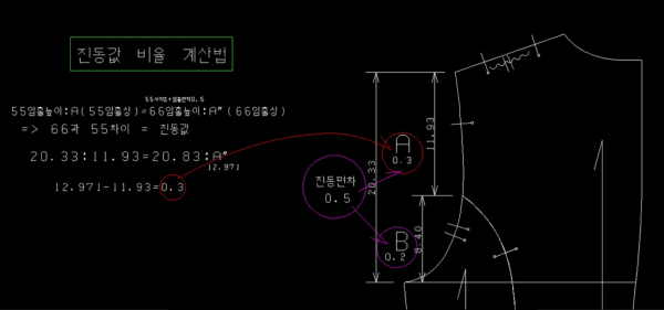 소매 셔링값이 바뀌면 패턴에 작성된 수치를 다시 각 사이즈별 수치를 교정하고, 전개개시 후에는 문자도 함께 수정해줘야 해요.