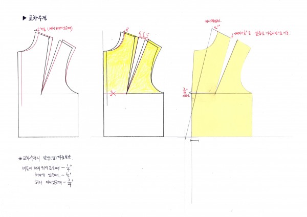 교차수정이란 앞이 오픈되어 많이 벌어지는 자켓에서 카라옆 어깨아래쪽에 생기는 주름현상을