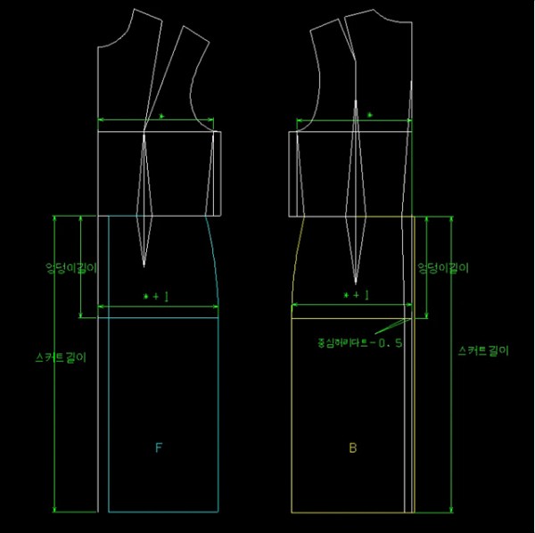 마지막으로 토루소 원형은 세로로 길이를 연장하고, 앞뒤 엉덩이 둘레선 끝점을 가슴둘레+1로 잡고, 뒤중심 끝점은 뒤 허리다트-0.5로 해주는 순서였어요.