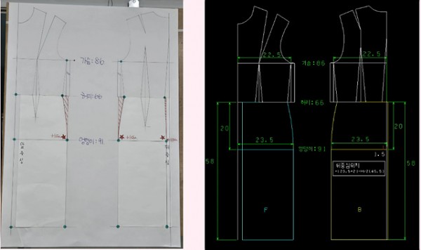 그다음 상의원형과 스커트 패턴을 자연스럽게 맞추도록 옆선을 기준으로 여유분(1.5)을 제거하고, 앞뒤 중심이 벌어져 있는 점도 확인했어요.