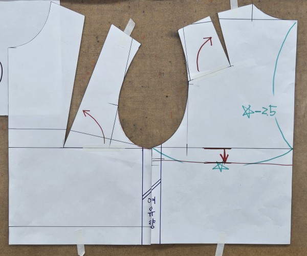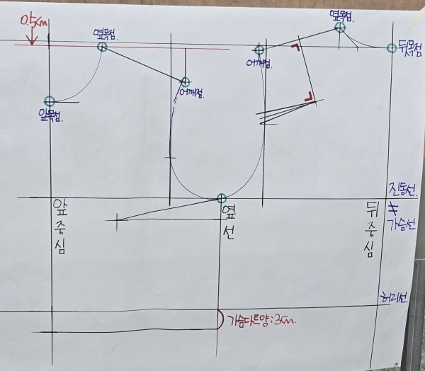 - 뒤 다트: 어깨 2등분선에서 직각으로 9~10cm 위치에 설정하였으며, 암홀 쪽으로 직각선을 기준으로 다트 분량을 조정하였습니다.