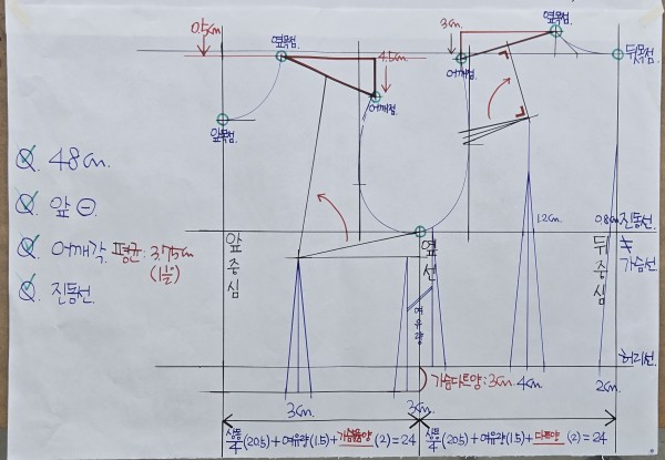 - 앞판(24cm) = 상동/4(20.5) + 여유량(1.5) + 가슴 볼륨양(2)