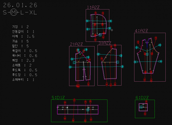 - E시리즈 이용해서, 기본사이즈 편차에 맞게 늘려주고 요척내기 (이때, 패턴 따로 빼고, 요척 들어가는 사이즈만 LCOP로 복사해주고, E시리즈로 편차 임의로 늘려주기)