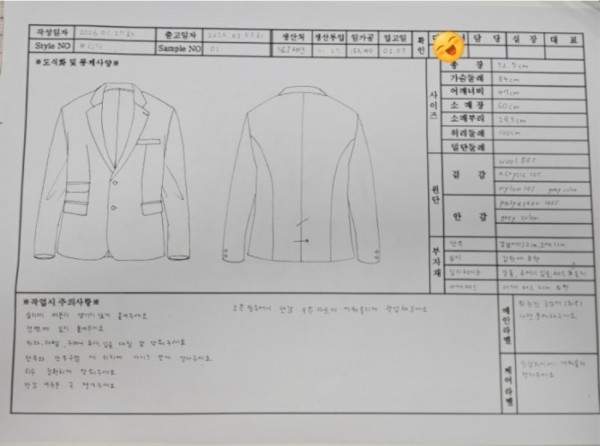 작업지시서 양식입니다! 여기에 시험문제를 채워 그릴 거에요. 시험은 두번째줄 자켓을 그리는 문제였는데요. 생각보다 공을 들여야해서 열심히 그렸답니다.
