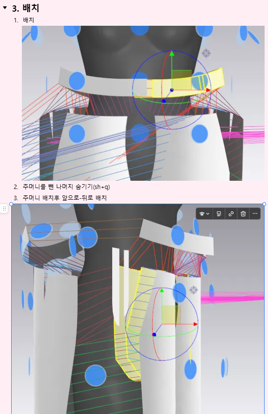 - 오비를 처리하며 내부 선분 활성화, 겹패턴 복제 등을 통해 자연스럽고 정교한 봉제를 완성하는 방법을 익혔습니다.