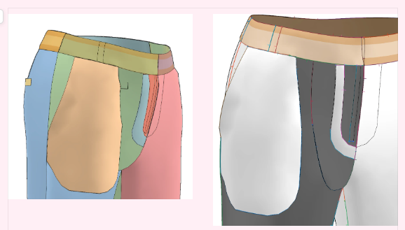 - 바지 2 제작 과정에서는 충돌 방지를 위해 스티치 선을 잘라내는 등 디테일한 조정을 진행했습니다.