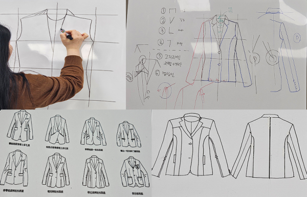 특히 피크드라펠, 숄카라(남자), 노카라, 고지라인, 등 이 외에 허리선 절개가 들어갈때 소재 또는 컬러를 다르게 할 수 있는데 디자인 적인 요소를 고민해 보는 것도 디자인영역이라고 하셨습니다.