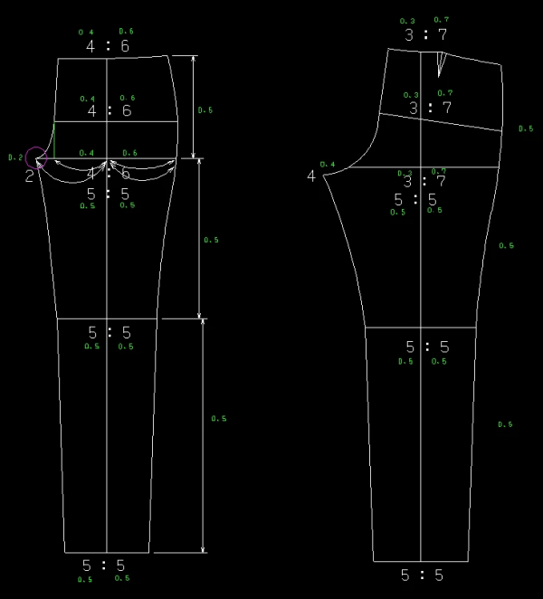 뒤판은 허리와 힙을 3:7로 시작해 샅 부분에서 추가 값을 더해 앞판과 동일한 5:5 비율을 맞추도록 했습니다.