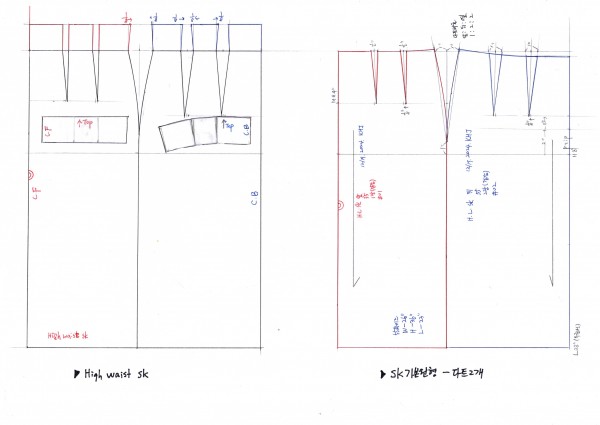 다트2개인 기본스커트원형을 먼저 제도하고 그걸바탕으로 허리선을 올려 하이웨스트 스커트를 제도한다.