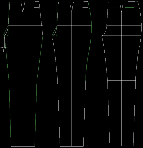 뒤 중심선을 기준으로 밑위 연장, 옆선, 벨트선, 다트 등을 추가했습니다.