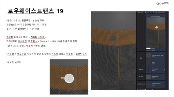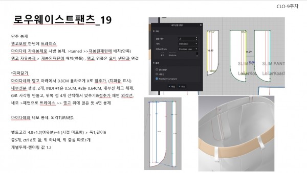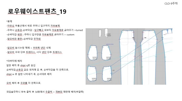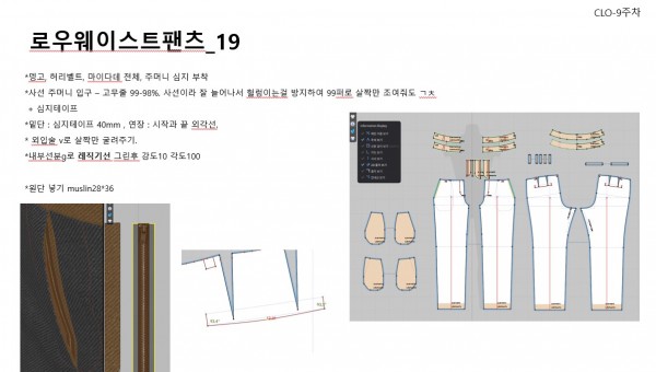 패턴, cad와 마찬가지로 clo도 다른 것들보다 바지가 훨씬 더 복잡할거라 예상되어서 평소보다 더 집중하여 들었습니다.