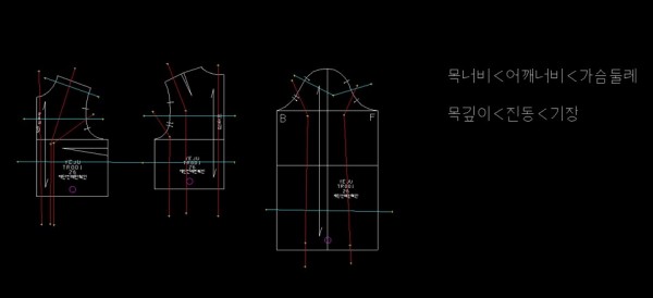 (빨강선) 목너비 < 어깨너비 < 가슴둘레