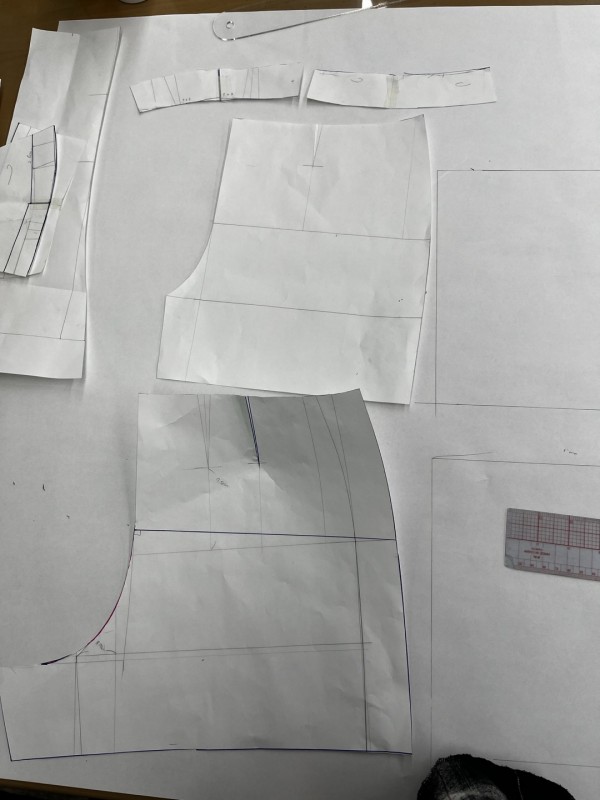 이번시간에는 반바지 패턴을 재단하는 방법을 배웠습니다. 반바지 패턴을 그릴 때 6자 암홀자를 사용해서 곡선을 그렸는데 원하는 모양이 잘 나오진 않았으나 강사님의 도움으로 패턴을 완성했습니다. 반바지는 로우웨이스트로 만들었는데 다음과 같이 오비를 만들었습니다.