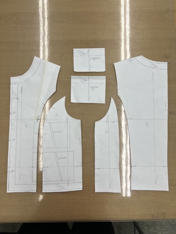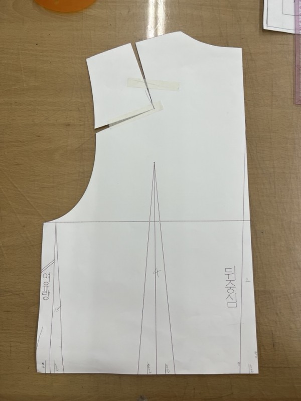 뒷목점에서 어깨포인트가 1cm내려간 패턴은 반다트원형을 쓴 것이다.
