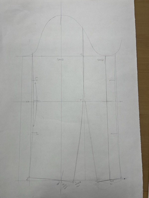 5. F소매통 부리 0.5 나온 곳부터 24cm 표시 후, 남는 길이 체크. > 뒤 절개선에 남는 만큼 다트 표시
