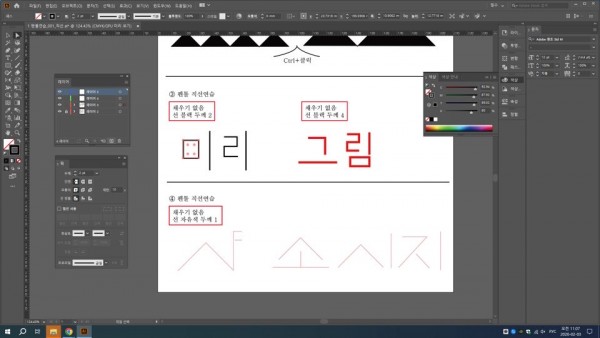 3.오른쪽메뉴 살피기(없으면 윈도우에서 메뉴 꺼낼 수 있음): 두 열의 메뉴로 안쪽(더 오른쪽)에 문자, 획, 레이어 순으로 쌓아넣기