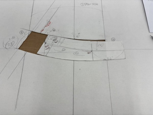 6.단작표시, 단춧구멍 표시(약간의 작은 치수로 단작 벗어나도록), 끝 곡선 굴려주기