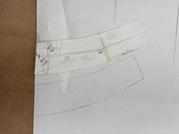 3.(3+1/2) 왼쪽으로 시작해 치수 측정, 그 부분까지 일자, 이후부터 끝까지 곡선(위로 1+1/4 띄우기): 자의 곡선부분 양측으로 두번 이용해 곡선 그리기