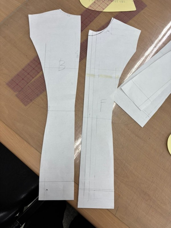 셔츠 패턴으로, 소매 제외 몸통(앞,뒤)와 카라,밴드를 그리고 잘랐다.