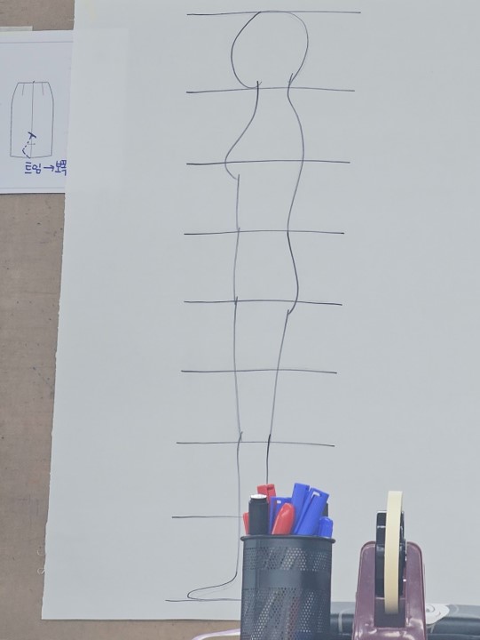 종이가봉을 통해 제허리선에 착장할 때 필요한 다트 위치와 분량을 직접 설정하고 H라인 핏을 만들기 위해 추가되어야 하는 분량을 고민해볼 수 있었습니다.