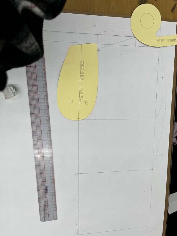 이번시간에는 반바지 패턴을 재단하는 방법을 배웠습니다. 반바지 패턴을 그릴 때 6자 암홀자를 사용해서 곡선을 그렸는데 원하는 모양이 잘 나오진 않았으나 강사님의 도움으로 패턴을 완성했습니다. 반바지는 로우웨이스트로 만들었는데 다음과 같이 오비를 만들었습니다.