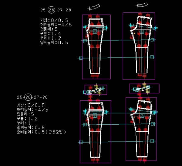 -바지 그레이딩시 정석으로 절개량 주는 법은 앞판 허리선은 레지끼선을 중심으로 4:6, 힙선과 허벅지선도 4:6, 그 아래는 5:5 로 해주고 뒤판은 허리선은 레지끼선을 중심으로 3:7, 힙선과 허벅지선도 3:7, 그 아래는 5:5로 비율을 맞춰준다.