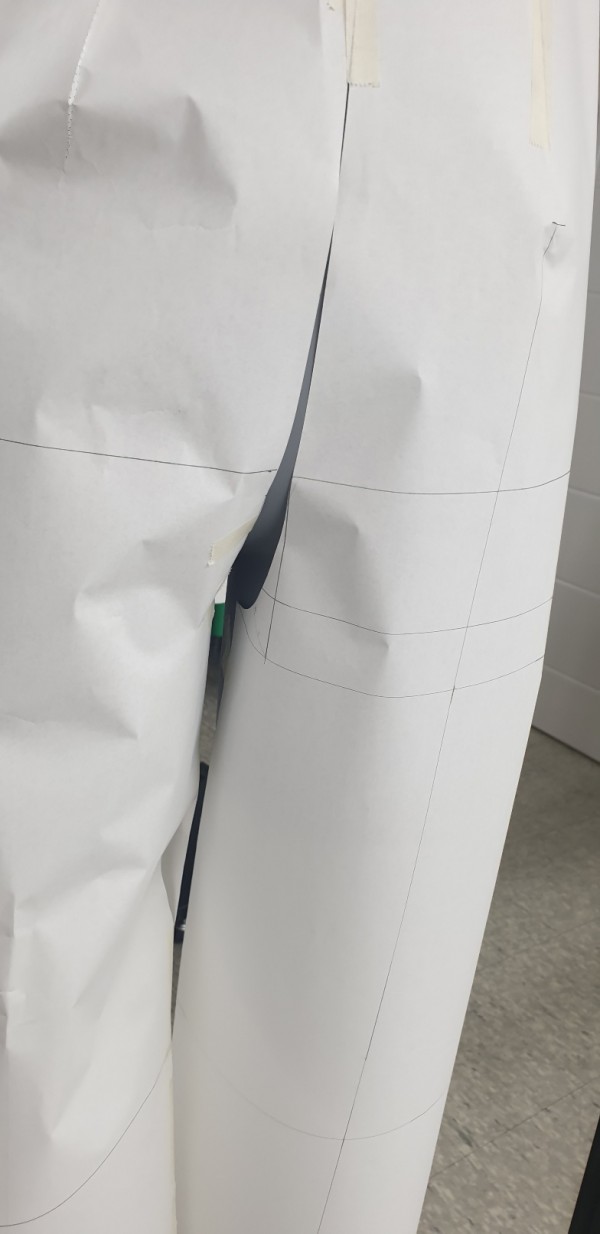 와이드 팬츠의 밑위길이는 인체 밑위선보다 3cm 내려온 선으로 제도했는데, 종이 가봉을 해보니