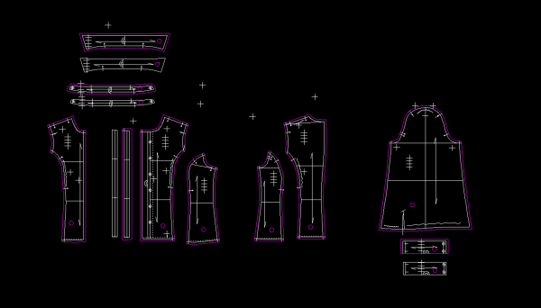 이 패턴들에서의 시다 패턴들: 앞 판 왼 쪽 패턴, (이와 봉제되는) 칼라 밴드 및 칼라 패턴에서의 왼 쪽 부분들