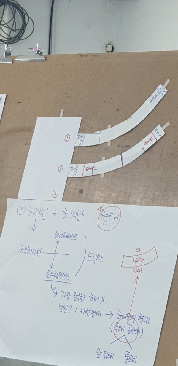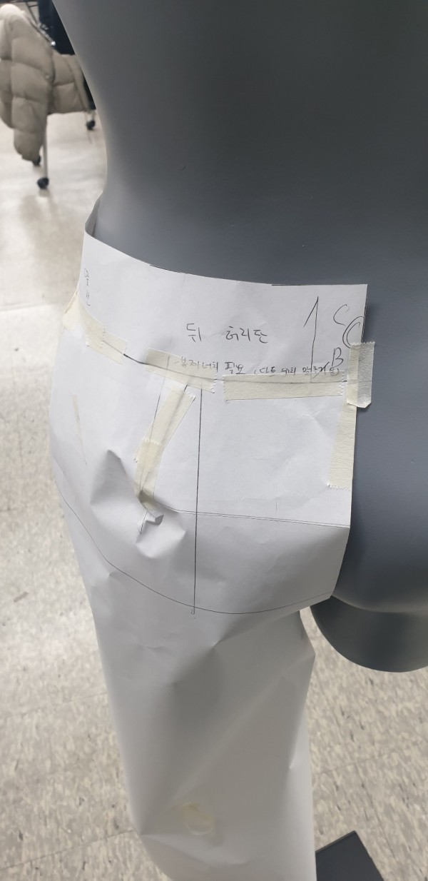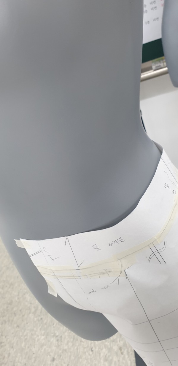 종이 가봉한 것을 보면 벨트의 위허리라인이 몸에 붙는게 아니라 여유가 있는 것을 볼 수 있습니다.