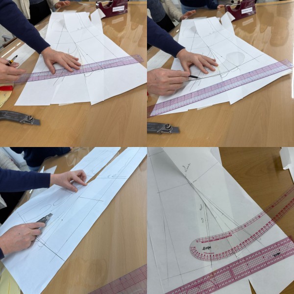 - 앞, 뒤 패턴을 그리면서 모양이 서로 어떻게 달라져야 하고 몸에 불편하지 않게 그려서 재단해야 하는지 설명을 들었습니다.