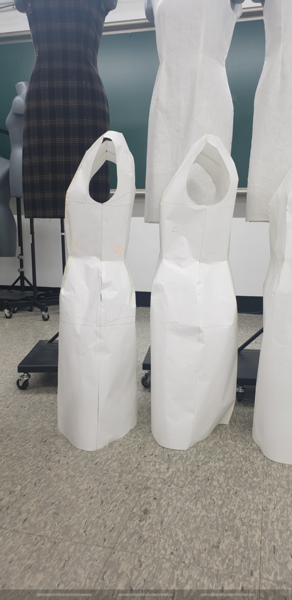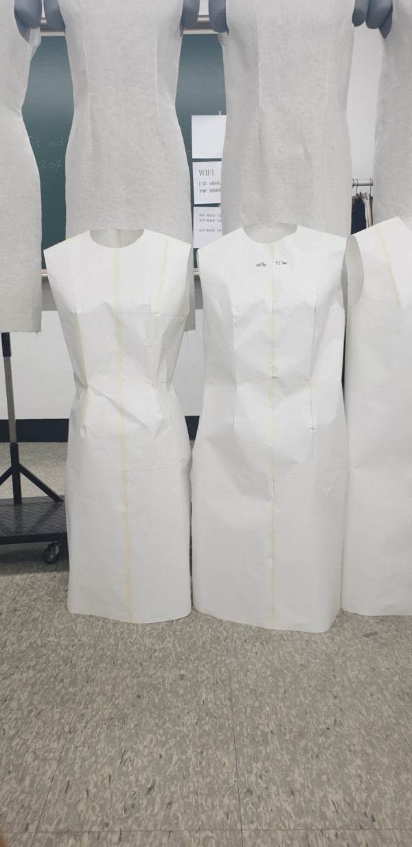 종이가봉을 통해서 여유량차이에 따른 실루엣의 차이와 핏, 슬림, 박스의 차이를 눈으로 확인해보는 시간을 가졌습니다.