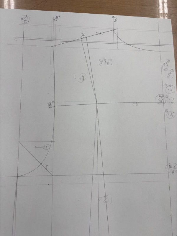 2.줄인 부분에서 어깨길이 원형길이만큼 잡아 잡기 전 원 어깨선(가로조정 맨 아랫선)과 교차되는 부분까지 어깨선 각도로 대각선 그린다