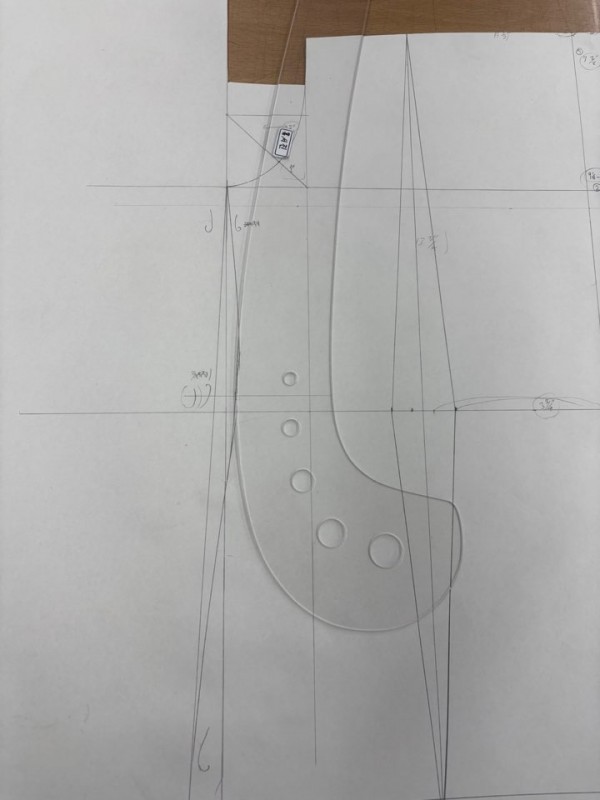3.뒷판 와끼를 앞판 다트를 잡아 줄인 와끼에 대고 베껴 넣는다 암홀선과 10인치 선의 가로길이(세로선)을 맞춘다