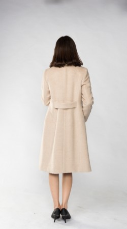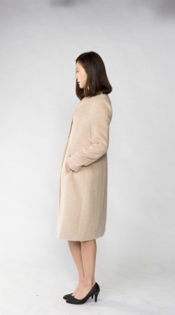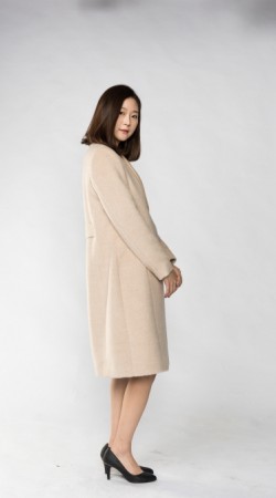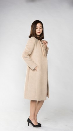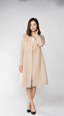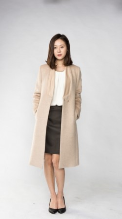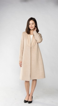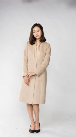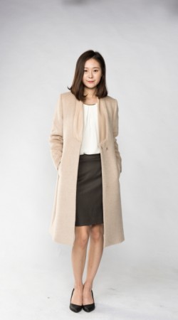 반더블 여밈에 카라 부분은 비대칭으로 레자배색을 주엇습니다. 허리 라인이 살짝 들어가서 여성스러운 느낌을 물씬 풍겨줍니다.