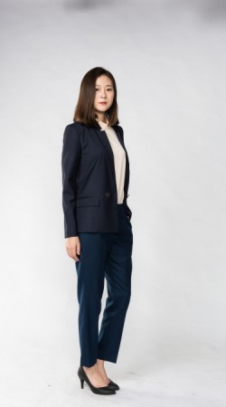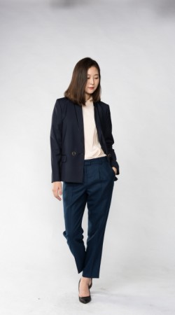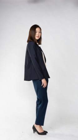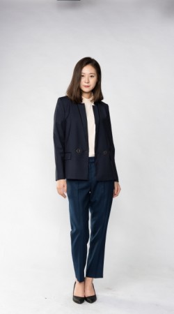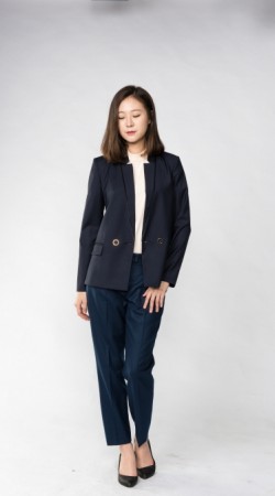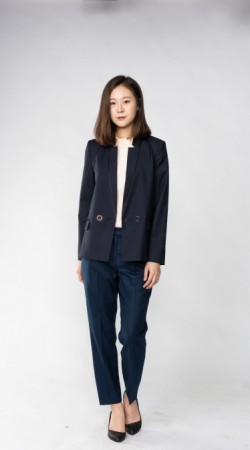 칼라부분이 세워진 듯 한 느낌을 주는 변형된 스타일로 카라와 라펠 부분에 배색을 끼워 물렸습니다.